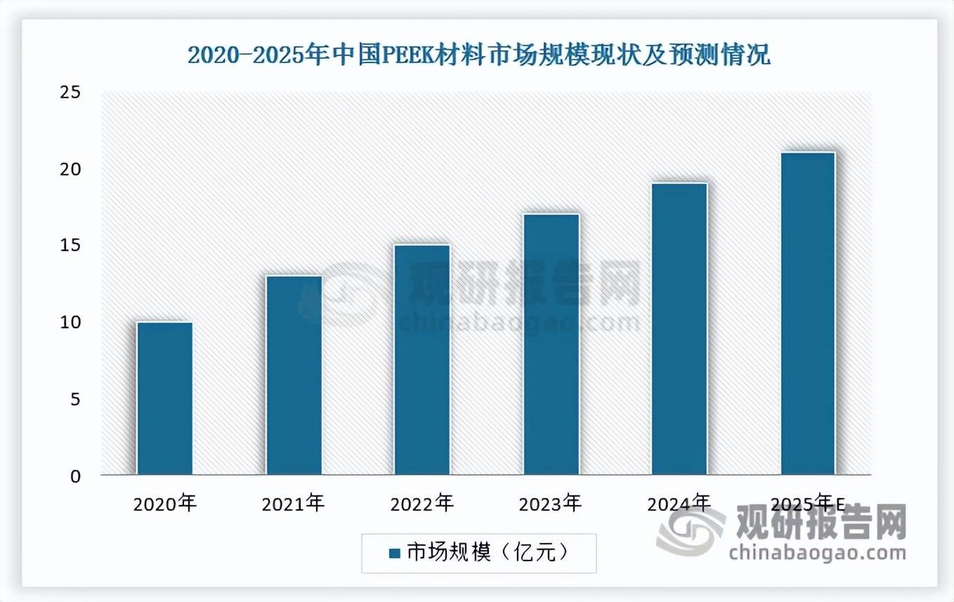 PEEK材料于1978年被首次成功开发,并于1990年代正式商业化。随着商业化的持续推进,全球PEEK生产能力不断提升,对应的市场规模也稳步增长。根据数据,2024年,全球PEEK材料市场规模约为61亿元,同比增长10.9%,预计2025年全球PEEK材料市场规模将逼近70亿元。其中,2024年,中国PEEK材料市场规模约为19亿元,同比增长10.9%,预计2025年市场规模将超过20亿元。